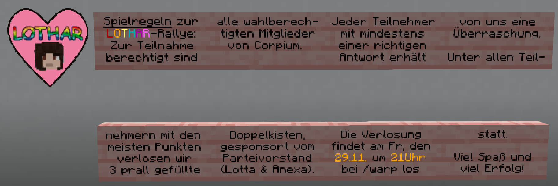 Um euch einen kleinen Vorgeschmack zu bieten, hatten wir für euch die LOTHAR-Rallye auf die Beine gestellt. Damit haben wir nicht nur einem zum Teil leerstehenden Gebäude Leben eingehaucht und dadurch den Server wieder ein Stückchen schöner gemacht, sondern euch Spaß, Spiel und Action geboten.