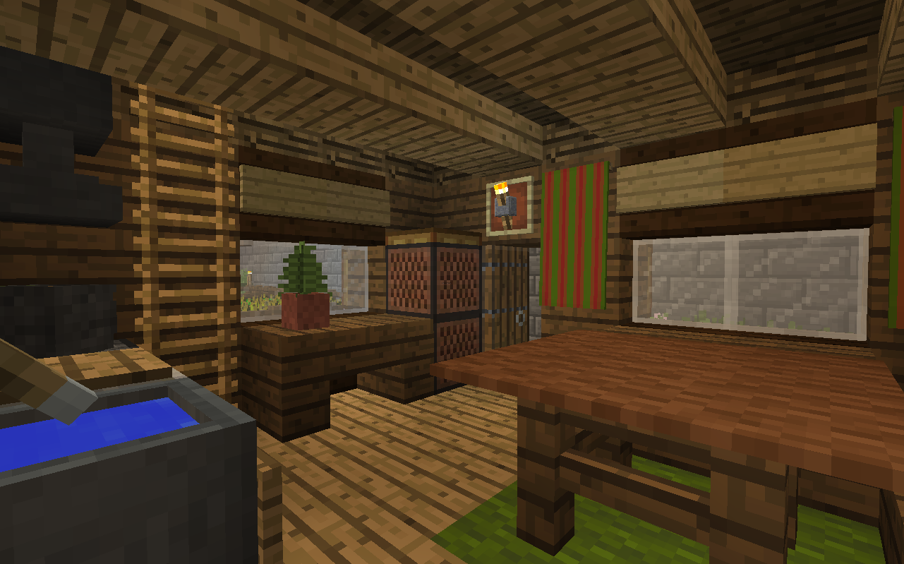 Die Inneneinrichtung ist zwar passend zum Ambiente rustikal gestaltet; fast leere Etagen und Räume sind dann allerdings zu rustikal. Bei der Inneneinrichtung darf man sich ruhig was trauen und auch mal von den vier Klassikern Herd, Workbench, Kiste und Bett abweichen. Variation macht viel aus. Von plötzlichen Decken Materialmixen aus Birke würden wir Abstand nehmen. Wir haben mal ein Beispielhaus errichtet. Ihr könnt ja mal schauen, ob ihr die anderen nicht mit dem ein oder anderem Detail verbessert ?
