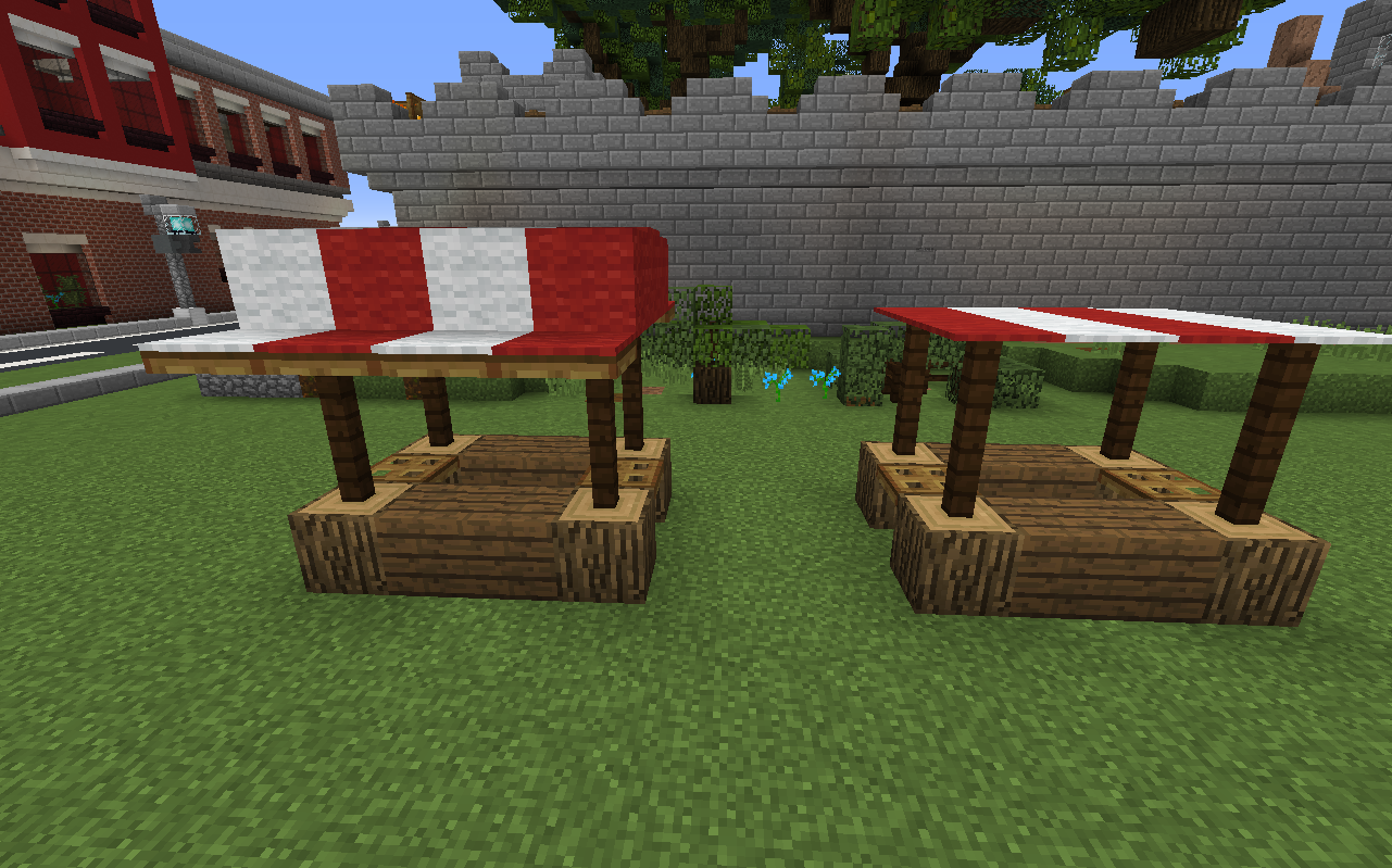 Der Marktplatz ist an sich gut und auch zentral platziert. Allerdings sind die Dächer der Stände etwas zu tief und zu klobig geraten. Vielleicht könntet ihr sie einen Block hochsetzten und filigraner gestalten. Beispiel: